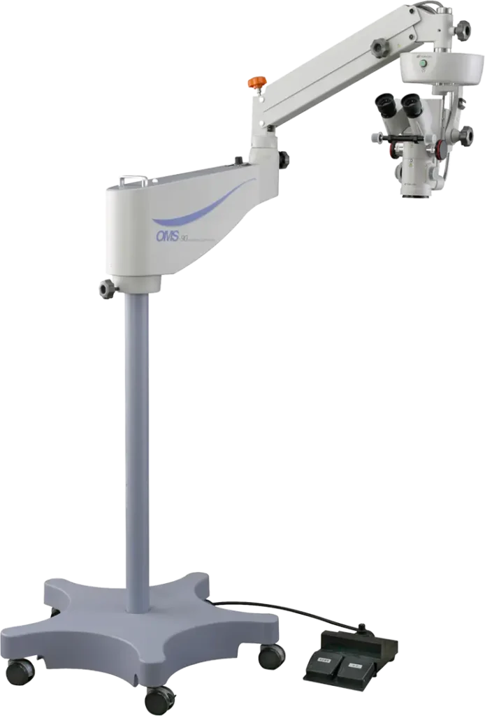 The OMS-90 Operation Microscope is the new standard in versatile microsurgery. It features a water-repellent coated objective lens, new coaxial illumination, a PD adjustment knob, and five-step magnification.